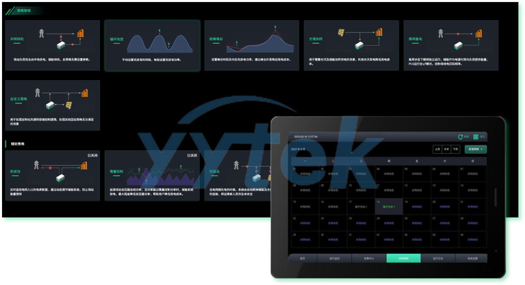 EMS系統(tǒng)支持全面的場(chǎng)站能源控制策略,包括并網(wǎng)待機(jī)、循環(huán)充放、削峰填谷、光儲(chǔ)協(xié)同、離網(wǎng)備電、自定義策略、防逆流、防孤島運(yùn)行、以及需量控制等。場(chǎng)站可以根據(jù)自身需求、當(dāng)?shù)仉妰r(jià)策略以及實(shí)際生產(chǎn)用電情況,按天設(shè)置相應(yīng)的控制策略。同時(shí),系統(tǒng)支持連接云涌VPP運(yùn)營(yíng)管理系統(tǒng),接收虛擬電廠平臺(tái)下發(fā)的需求響應(yīng)策略并執(zhí)行。