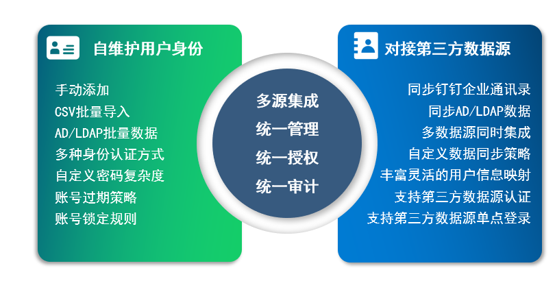 云涌零信任安全管理平臺既支持主流企業(yè)通訊錄系統(tǒng)的數(shù)據(jù)導(dǎo)入與同步,也支持自建用戶體系。實現(xiàn)了在一個平臺對企業(yè)人員、部門以及角色組的統(tǒng)一高效管理。同時系統(tǒng)提供多種用戶認(rèn)證方式,全方位滿足各種需求場景。