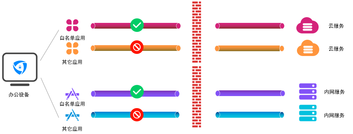 云涌零信任系統(tǒng)始終保證僅“合法”的本地應(yīng)用才能訪問內(nèi)網(wǎng)服務(wù)。只有經(jīng)過管理員授權(quán)的應(yīng)用進程才可以通過TLS隧道傳輸數(shù)據(jù)。系統(tǒng)將應(yīng)用與服務(wù)綁定,提高服務(wù)訪問的安全性。
