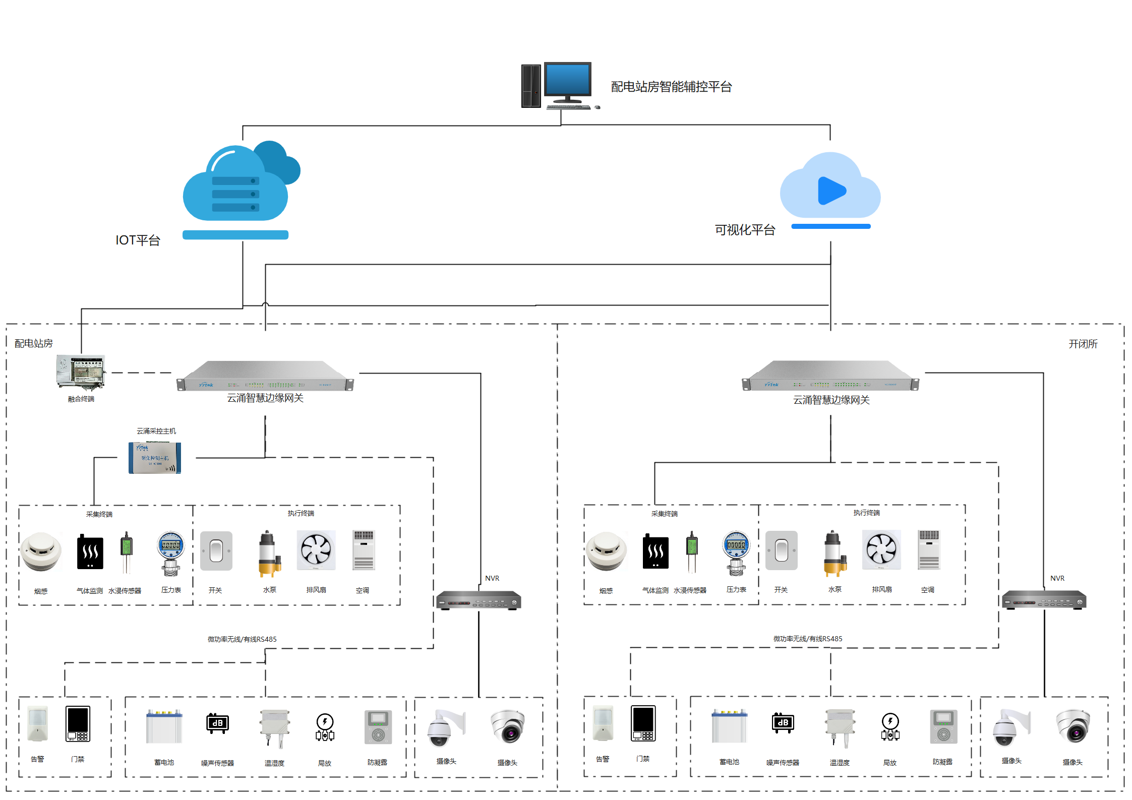 云涌智慧邊緣物聯網關是整個系統的中樞部分,不僅可以在站內進行實時數據的采集上傳,還能通過連接采控主機,實時接收站房環境的數據信息,同時對于接收到的設備狀態、安防信息、視頻監控等監測數據,及時上傳到IoT平臺和可視化平臺,最終對配電站房內各功能模塊的信息進行存儲、處理及分析,通過標準協議傳輸給配電站房輔助監控平臺。此外,邊緣物聯網關還可以及時接收平臺發布的智慧控制調節命令,通過啟停相關設備來進行環境調節,并同時反饋執行情況,設備傳感器實時采集信息反饋,平臺根據設備傳感器實時采集到的信息反饋,對調節結果進行再判斷,可實現不斷循環優化。