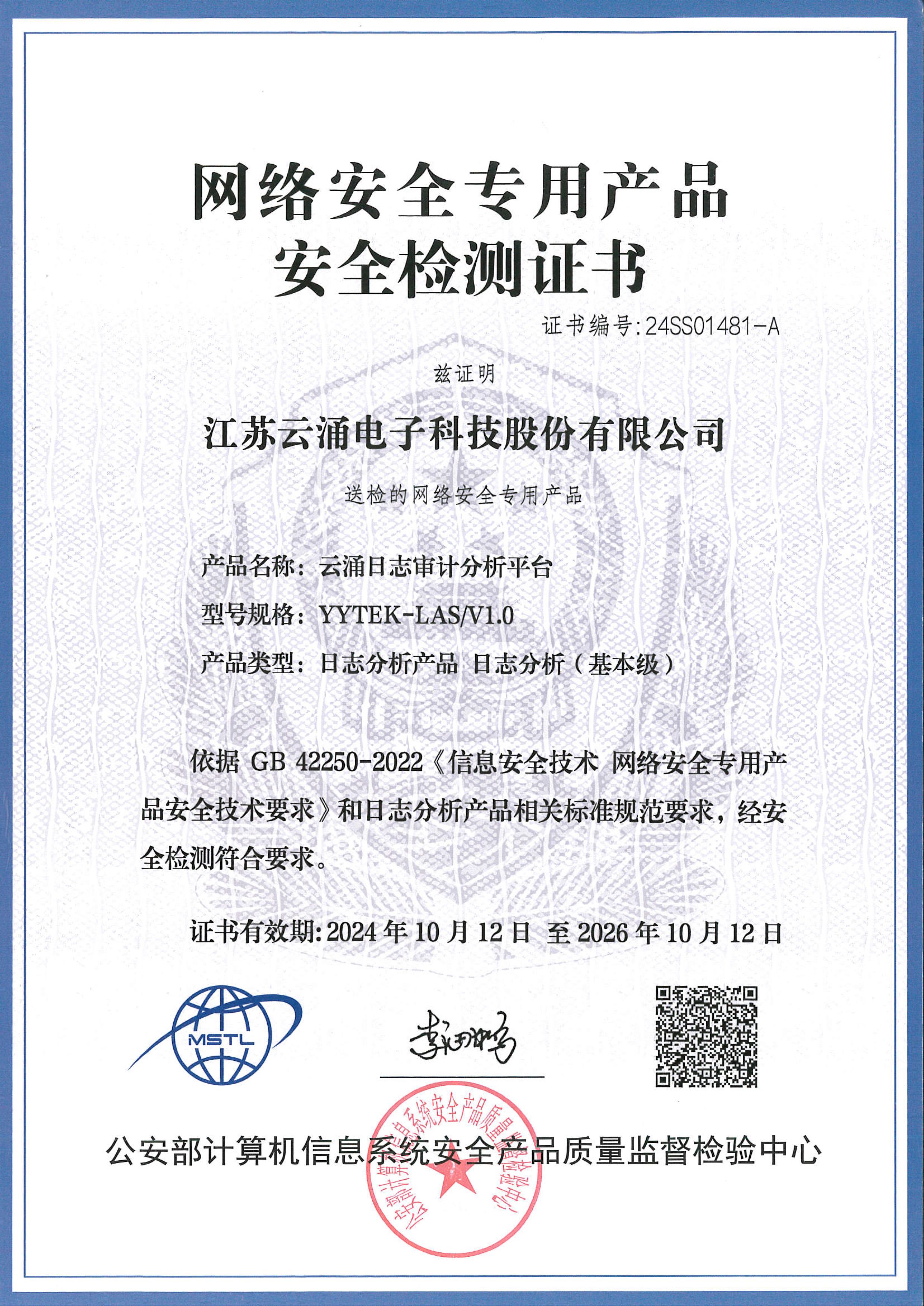 權威認證|云涌日志審計分析平臺獲得《網絡安全專用產品安全檢測證書》