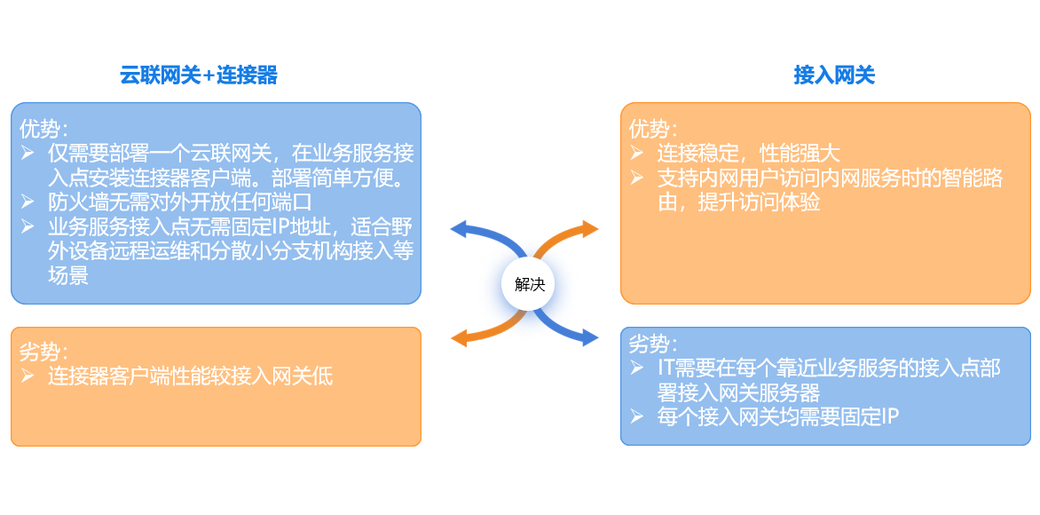 云涌零信任支持兩種內(nèi)網(wǎng)訪問模式:基于接入網(wǎng)關(guān)的訪問代理,以及基于云聯(lián)網(wǎng)關(guān)+連接器的內(nèi)網(wǎng)穿透。客戶可以根據(jù)自身IT架構(gòu)及實(shí)際需求選擇適合的服務(wù)訪問模式。兩種模式可以同時(shí)存在。