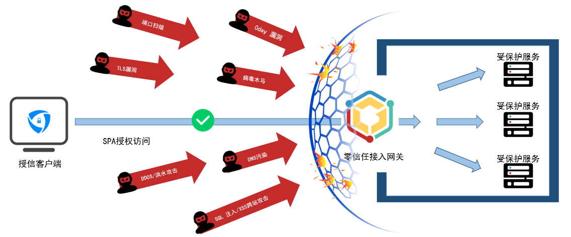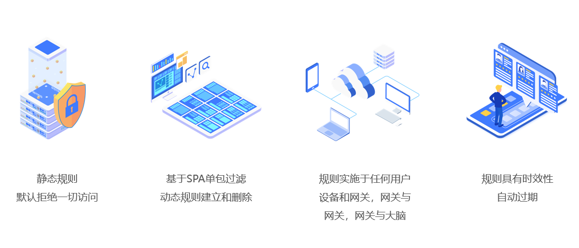?嚴(yán)格的終端單包敲門機(jī)制,確保只有認(rèn)證過的用戶及設(shè)備才能訪問受保護(hù)服務(wù);