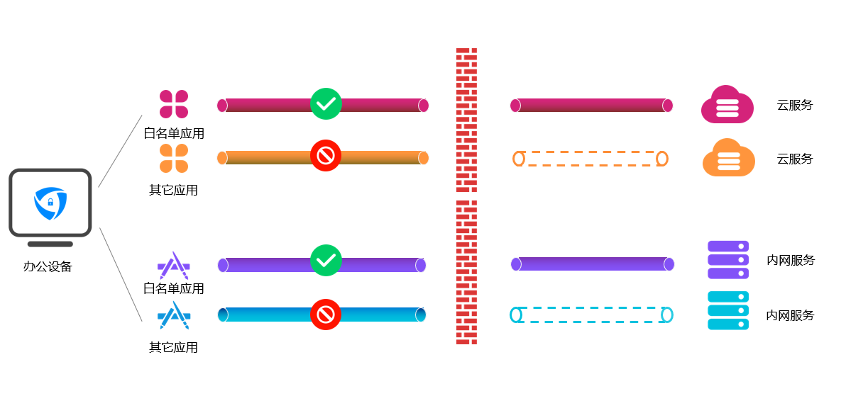 云涌零信任系統(tǒng)始終保證僅“合法”的本地應(yīng)用才能訪問業(yè)務(wù)服務(wù)。只有經(jīng)過管理員授權(quán)的應(yīng)用進(jìn)程才可以通過TLS隧道傳輸數(shù)據(jù)。系統(tǒng)將應(yīng)用與服務(wù)綁定,提高服務(wù)訪問的安全性。