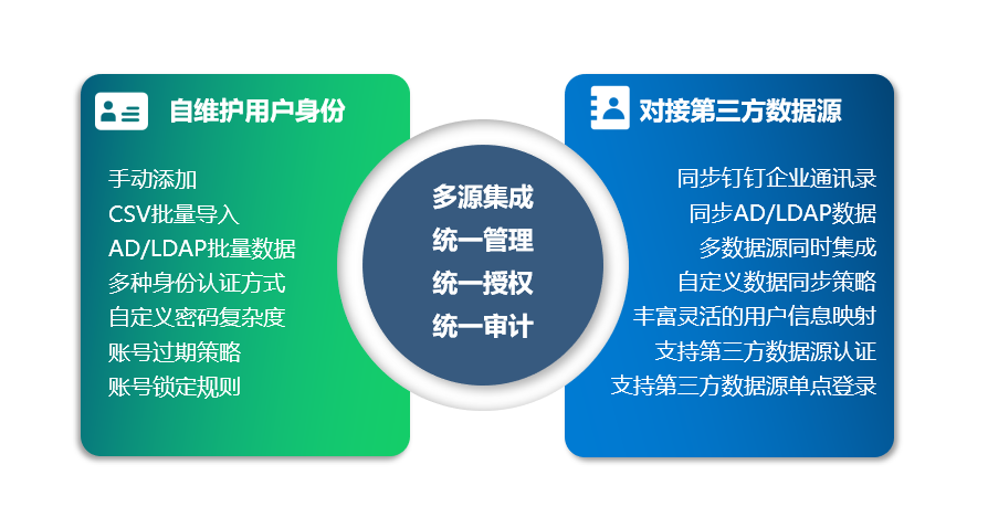 云涌零信任安全管理平臺(tái)既支持主流企業(yè)通訊錄系統(tǒng)的數(shù)據(jù)導(dǎo)入與同步,也支持自建用戶體系。實(shí)現(xiàn)了在一個(gè)平臺(tái)對(duì)企業(yè)人員、部門以及角色組的統(tǒng)一高效管理。同時(shí)系統(tǒng)提供多種用戶認(rèn)證方式,全方位滿足各種需求場(chǎng)景。