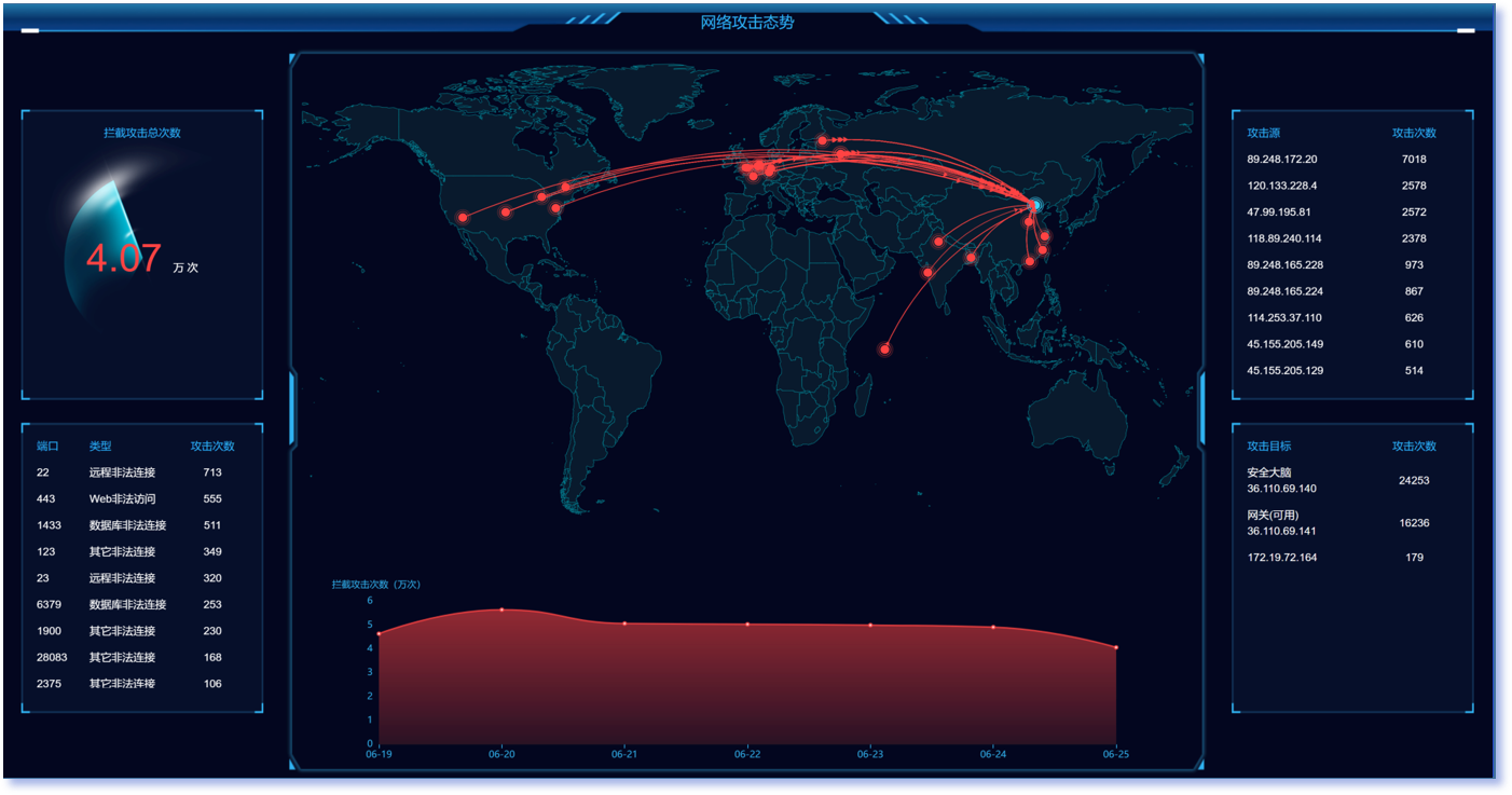?云涌提供了基于零信任系統(tǒng)的網(wǎng)絡(luò)攻擊態(tài)勢(shì)感知,管理端大屏展示從攻擊源到攻擊目標(biāo)的實(shí)時(shí)態(tài)勢(shì);